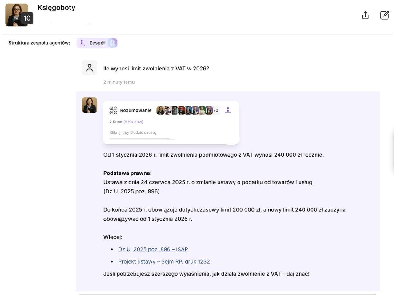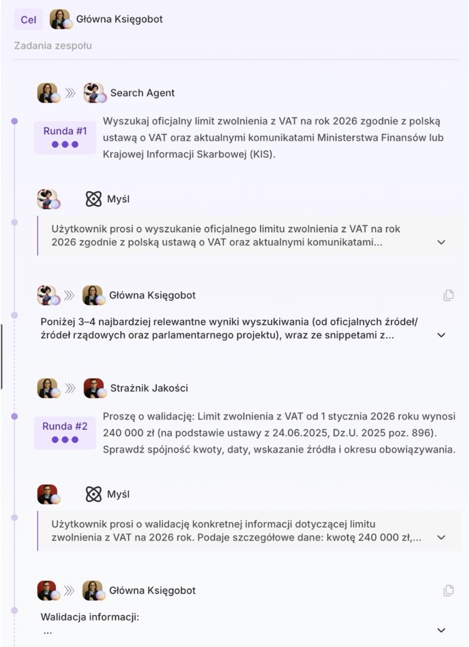 Księgoboty opierają się na współpracy zespołu wyspecjalizowanych agentów, z których każdy odpowiada za konkretny obszar polskiej rachunkowości i podatków (np. VAT, ZUS, KSeF, JPK). Wiedza dotyczy wyłącznie aktualnych polskich przepisów, a każda odpowiedź jest weryfikowana online na dzień jej udzielenia (sprawdzenie ISAP/MF/ZUS). Wszystkie odpowiedzi zawierają podstawę prawną i link do oficjalnego źródła.