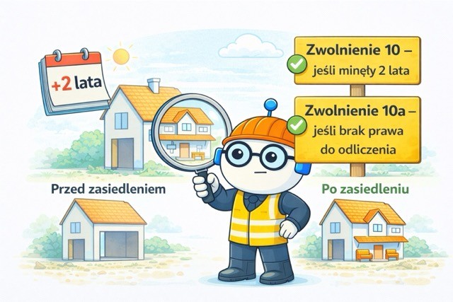 Zwolnienie (art. 43 ust. 1 pkt 10): Musi nastąpić pierwsze zasiedlenie i upłynąć co najmniej 2 lata od tej daty.