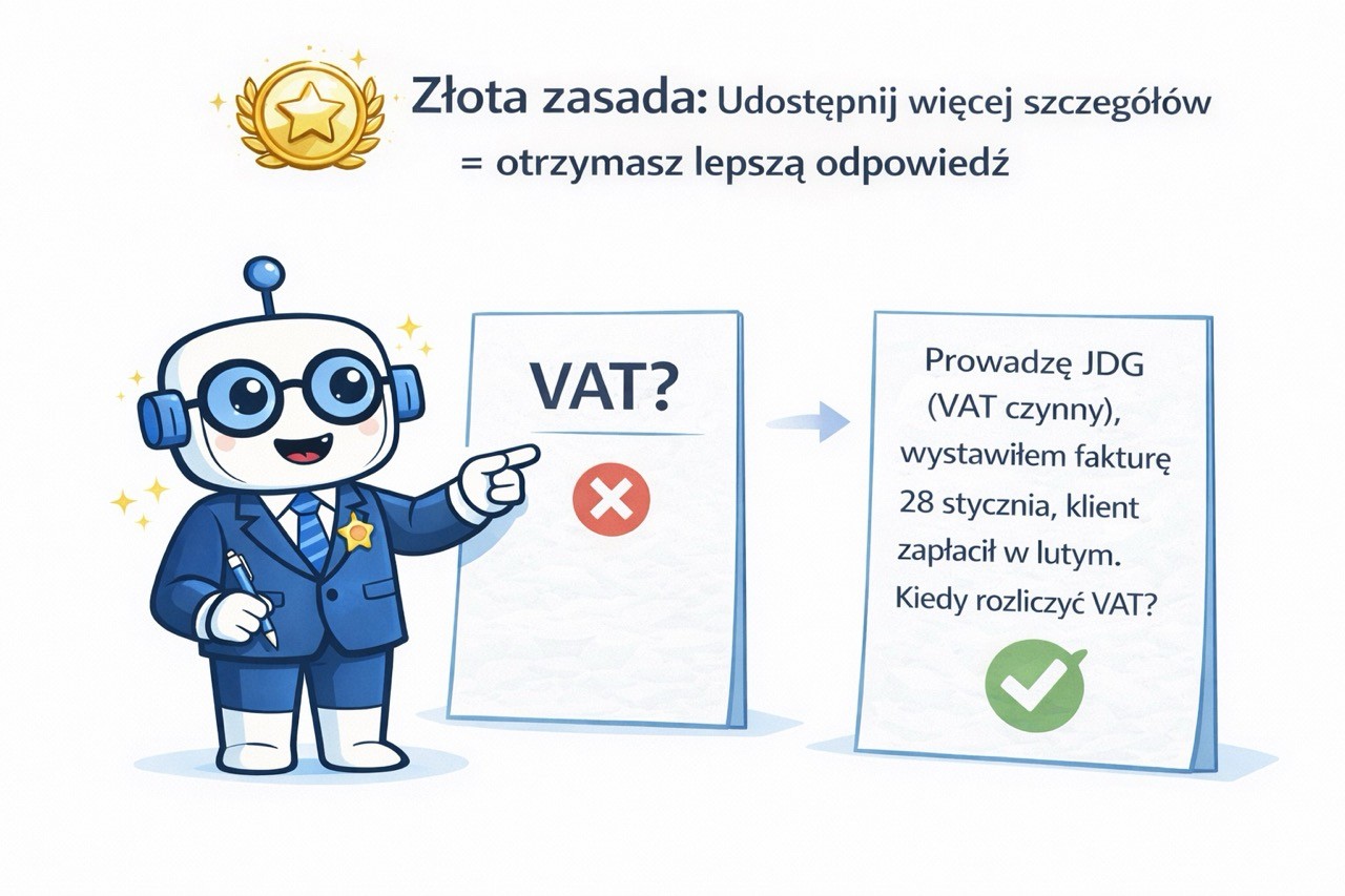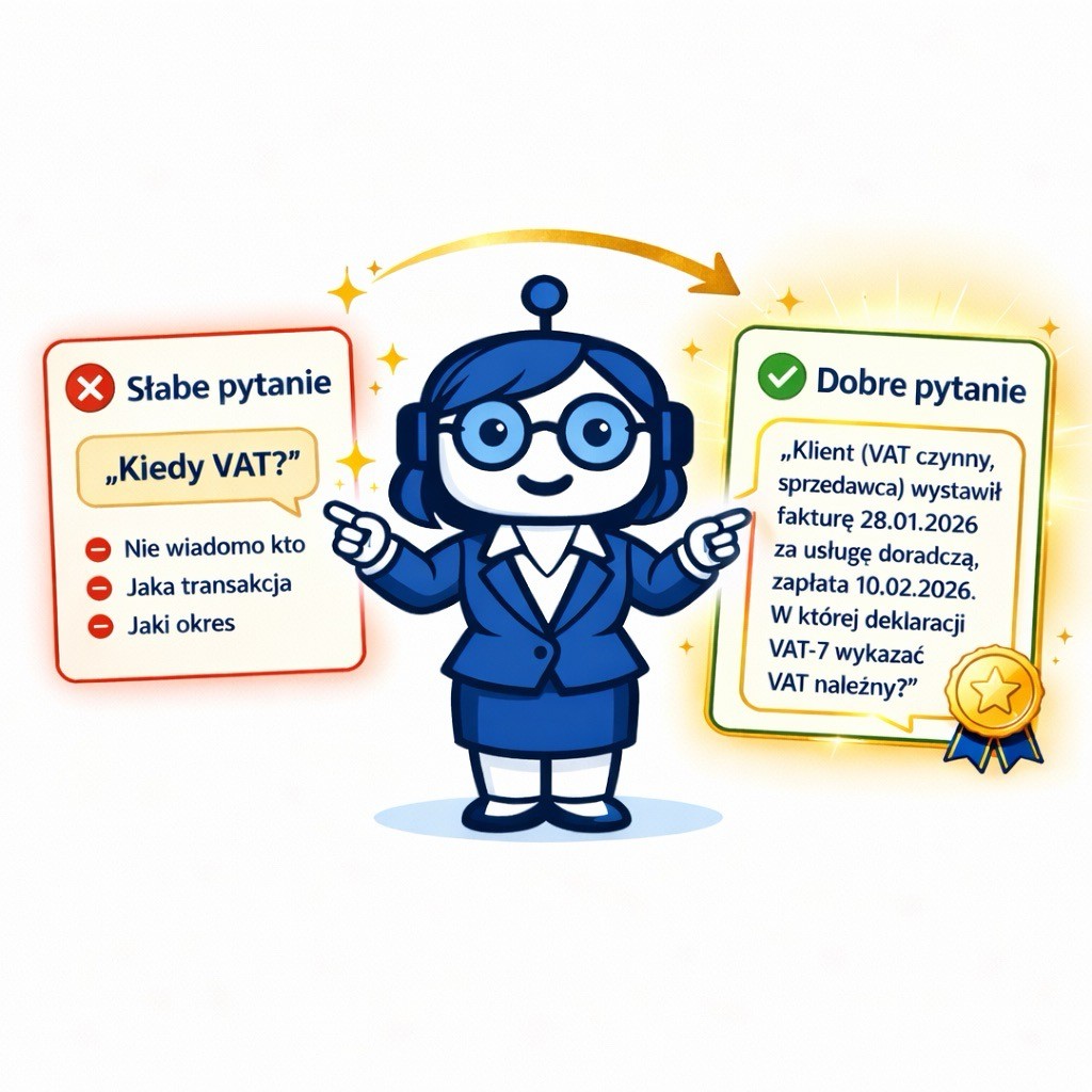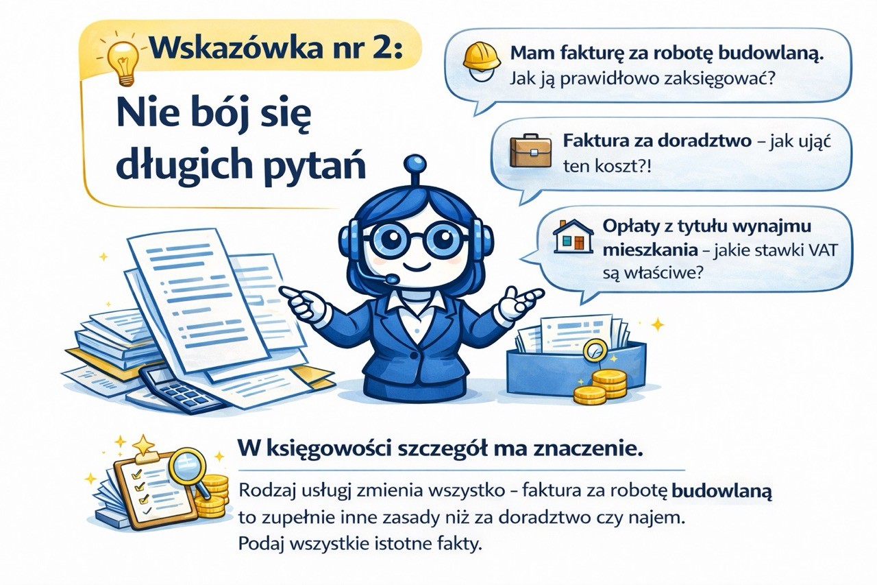 Księgoboty nie znają Twojego klienta. Nie wiedzą, jaką ma formę opodatkowania, czy jest VAT-owcem, ani czego dokładnie potrzebujesz. Twoje pytanie to jedyny most między Tobą a precyzyjną odpowiedzią.