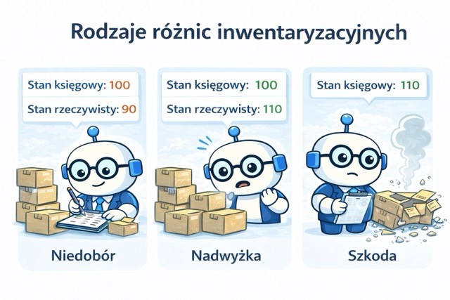 Uwaga: Ustawa o rachunkowości nie definiuje wprost poniższych pojęć - mówi o „różnicach między stanem rzeczywistym a stanem wykazanym w księgach” i obowiązku ich wyjaśnienia oraz rozliczenia (art. 27 ust. 1–2 uor). Poniższy podział to klasyfikacja praktyczna.