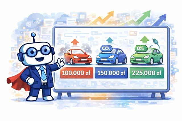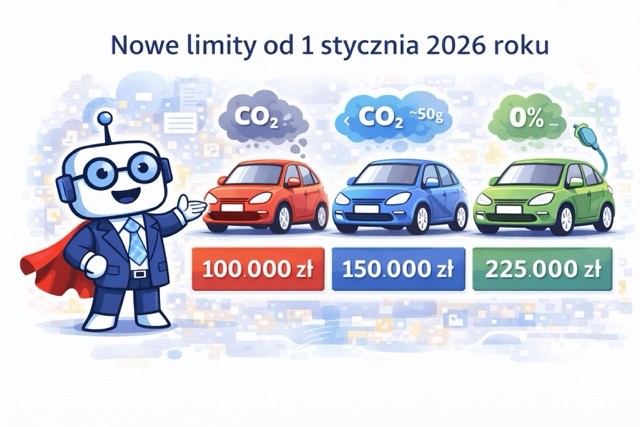 Od 1 stycznia 2026 roku pojawia się trzecia kategoria i podział uzależniony od emisji CO₂ pojazdu. Dla większości samochodów na polskich drogach (silniki spalinowe o emisji ≥ 50 g CO₂/km) oznacza to obniżenie limitu z 150 000 zł do 100 000 zł.